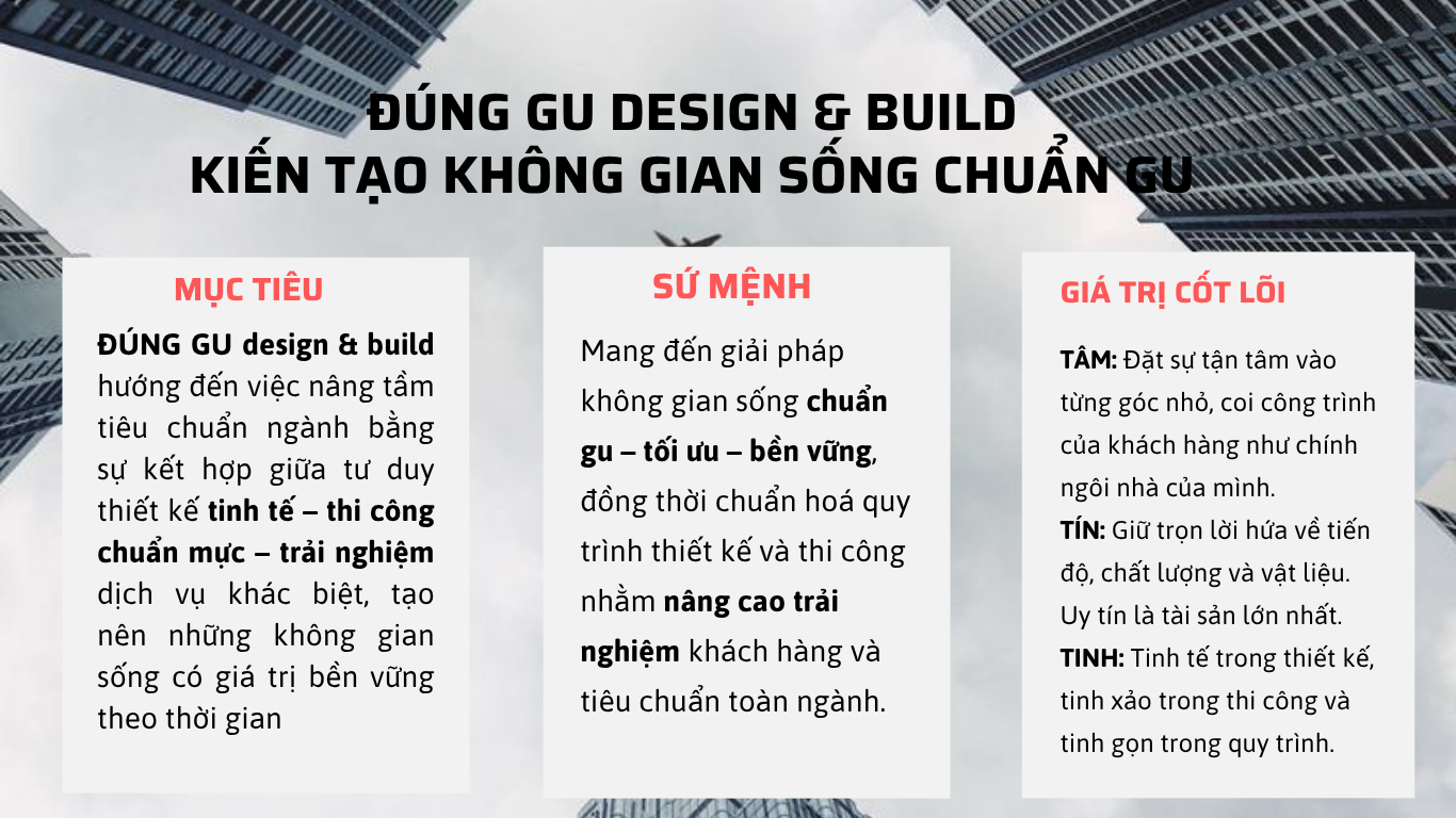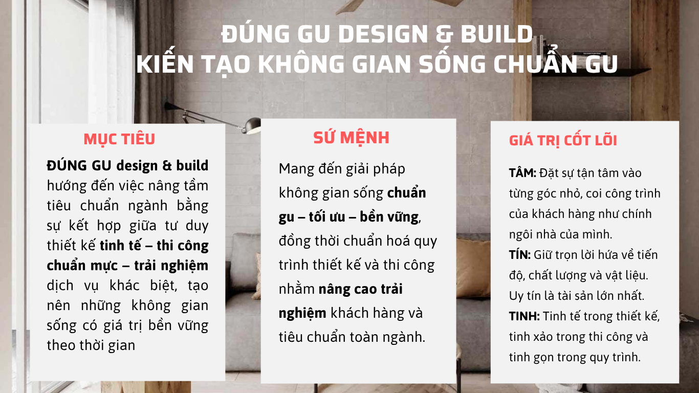 Sứ mệnh của chúng tôi là trở thành “người phiên dịch” ngôn ngữ cảm xúc của bạn thành những hình khối kiến trúc và không gian nội thất chuẩn mực. Dù bạn chọn phong cách nào, chúng tôi vẫn khởi đầu bằng sự tử tế trong thi công và sự tinh tế trong thiết kế.”