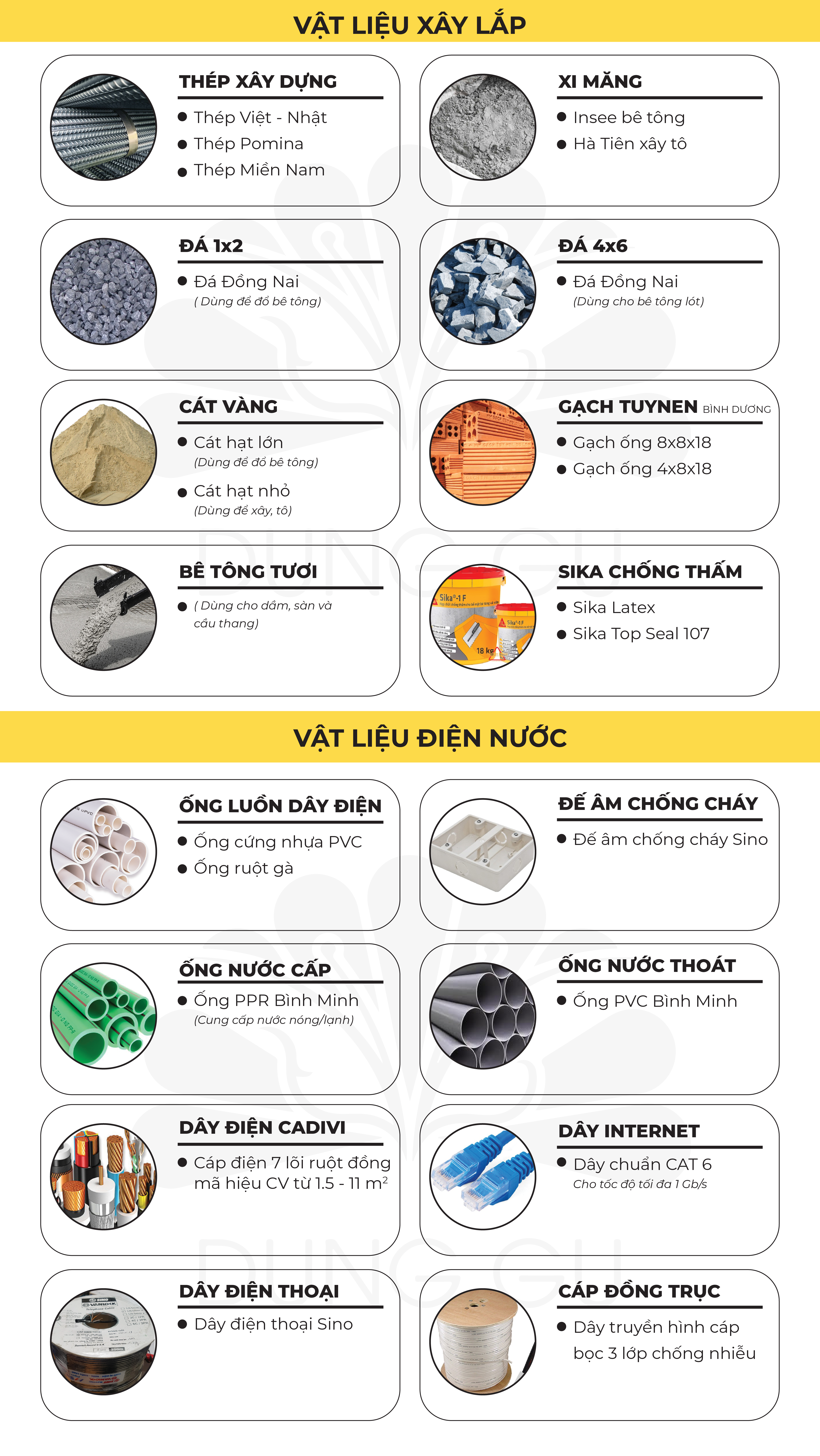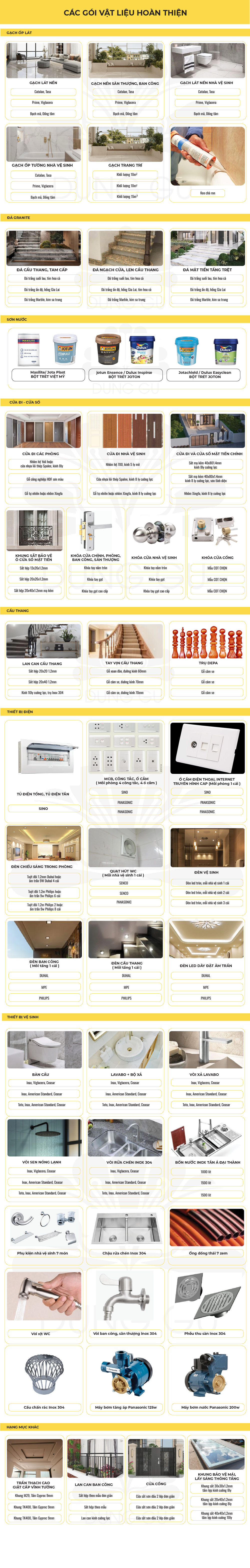 • Danh sách này có thể thay đổi theo sở thích của khách hàng, tùy theo chủng loại vật liệu hoàn thiện thay thế mà các kỹ sư của chúng tôi sẽ tính toán lại giá thành cho gia chủ.